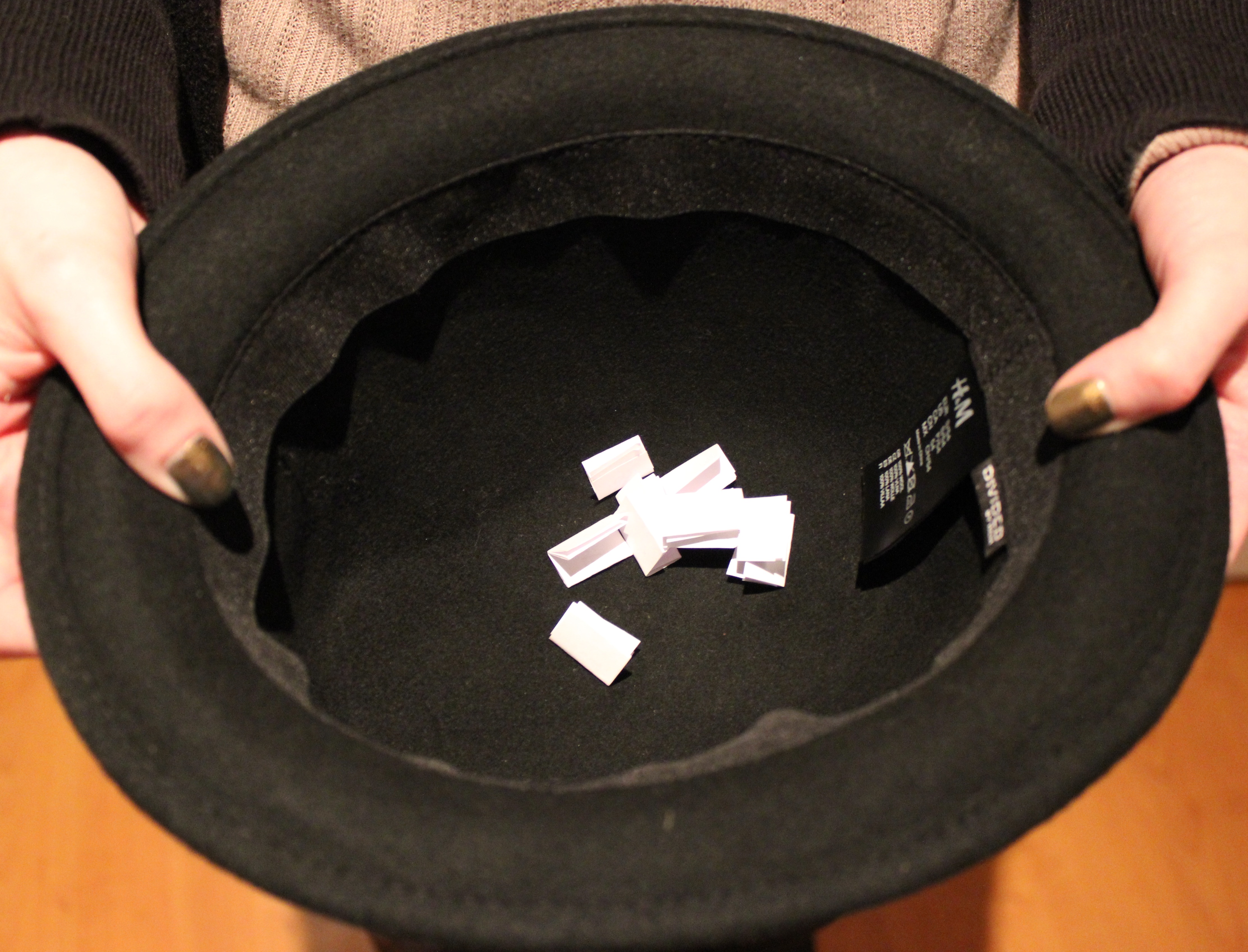 Ich habe eure Zettelchen beschriftet und gezogen (tatsächlich aus einem Hut)